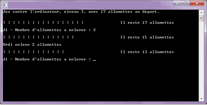 Au début, vous avez un nombre prédéfini d'allumettes. Chacun leur tour, 2 joueurs enlèvent une à trois allumettes. Celui qui doit enlever la dernière a perdu.